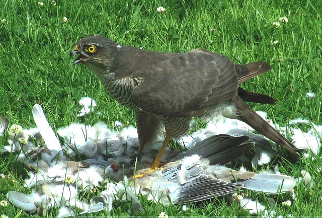 On the other hand you could sit in your warm sunny conservatory having a cup of coffee and a Goshawk drops down in front of you with a pigeon and proceeds to eat it 3 meters in front of you ! – reach for your compact camera lean forward and take a few shots.